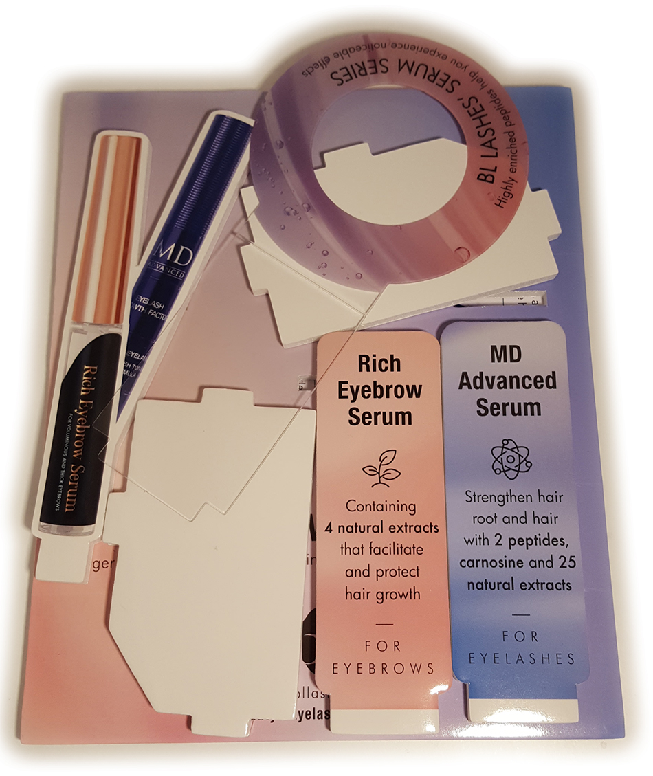 BL-WW-UTSTILLINGSMONTER MD-Advanced & Rich Eyebrow er en fin måte å vise frem kombinasjonen av serum for vipper og bryn, som Blink har i disse to produktene.